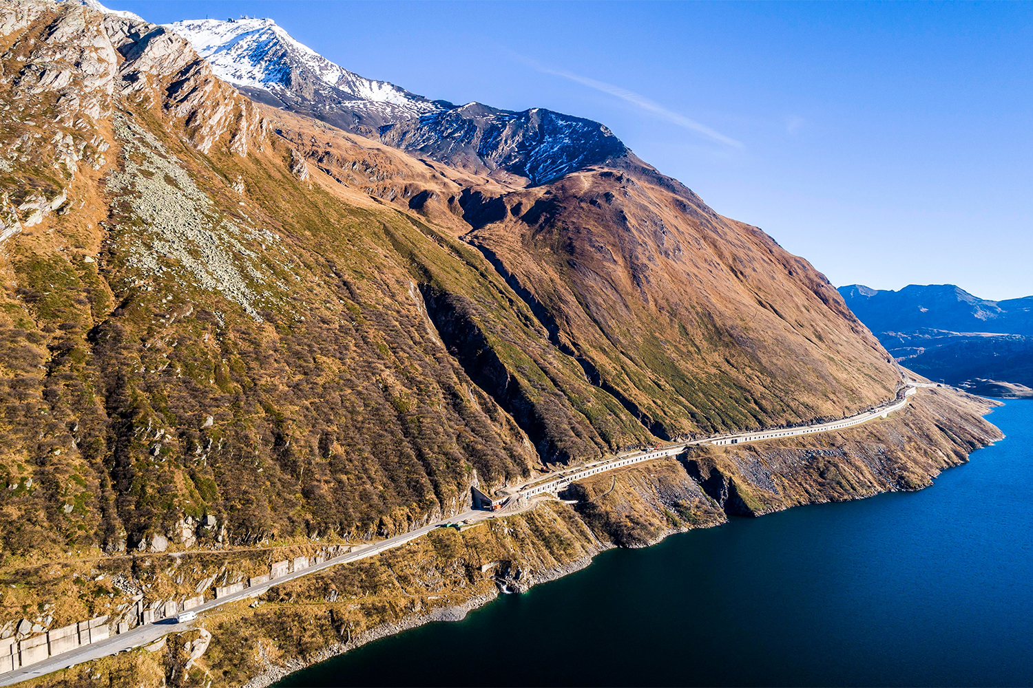 Elastisch, griffig und sicher: Asphalt ist in allen Höhenlagen der bevorzugte Strassenbaustoff. Diese Asphaltstrasse führt über den Lukmanierpass und enthält in den Unterschichten 70 bis 85 Prozent Recyclingmaterial.